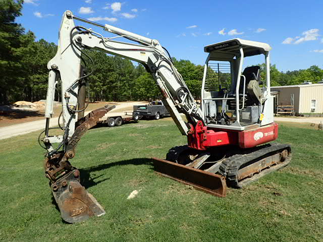 2000 Takeuchi TB138FR Mini Excavator Open Station ROPS, with Hyd. Thum & Hyd. Wrist a Twist Bucket 35in. Smooth Edge Bucket w/ Hyd. Swing away Boom 3057.2 hrs showing Yanmar Diesel